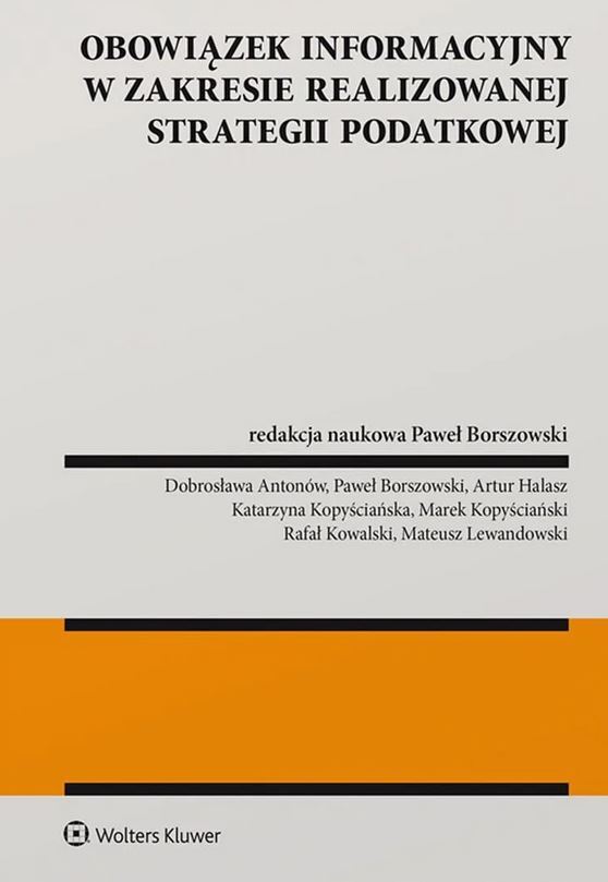 red. nauk. Paweł Borszowski ; aut. : Dobrosława Antonów, Paweł Borszowski, Artur Halasz, Katarzyna Kopyściańska, Marek Kopyściański, Rafał Kowalski, Mateusz Lewandowski. Obowiązek informacyjny w zakresie realizowanej strategii podatkowej /